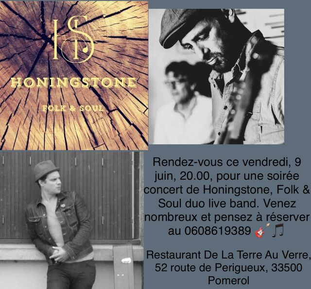 Rendez-vous ce vendredi, 9 juin, 20.00, pour une soirée concert de Honingstone, Folk & Soul duo live band. Venez nombreux et pensez à réserver au 0608619389 🎸🎵