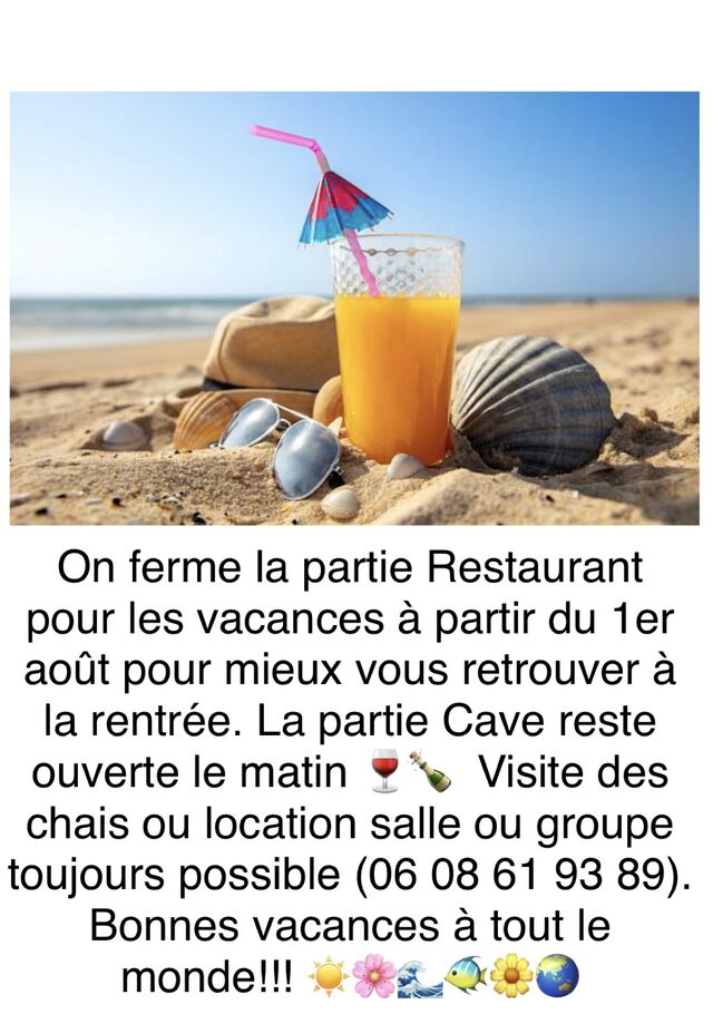 On ferme la partie Restaurant pour les VACANCES pour mieux vous retrouver à la rentrée le 9 septembre. La partie Cave reste ouverte le matin 🍷🍾 Visite des chais ou location salle toujours possible (06 08 61 93 89). Bonnes vacances à tout le monde!!! ☀️🌸🌊🐠🌼🌏