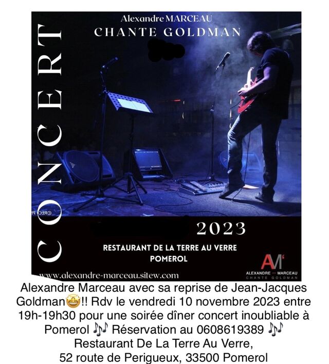 Quand la musique est bonne !!! 🎶🍷🍻🎸🥁 On est heureux de vous annoncer le retour de Alexandre Marceau avec sa reprise de Jean-Jacques Goldman époustouflante 🤩!! Rdv ce vendredi 12 mai 2023 entre 19h-19h30 pour une soirée dîner concert inoubliable à Pomerol 🎶 réservation au 0608619389 (menu complet 35 euros)🎶début du concert 20:40🎶 On vous attend nombreux! 😉🎶🍷🍻🎸🥁 #alexandremarceau #marceauvsgoldman #soiree #music #livemusic #goldman #prendredubontemps #pomerol🍷 #libournemaville #bordeauxmaville @alexandre_marceau_47