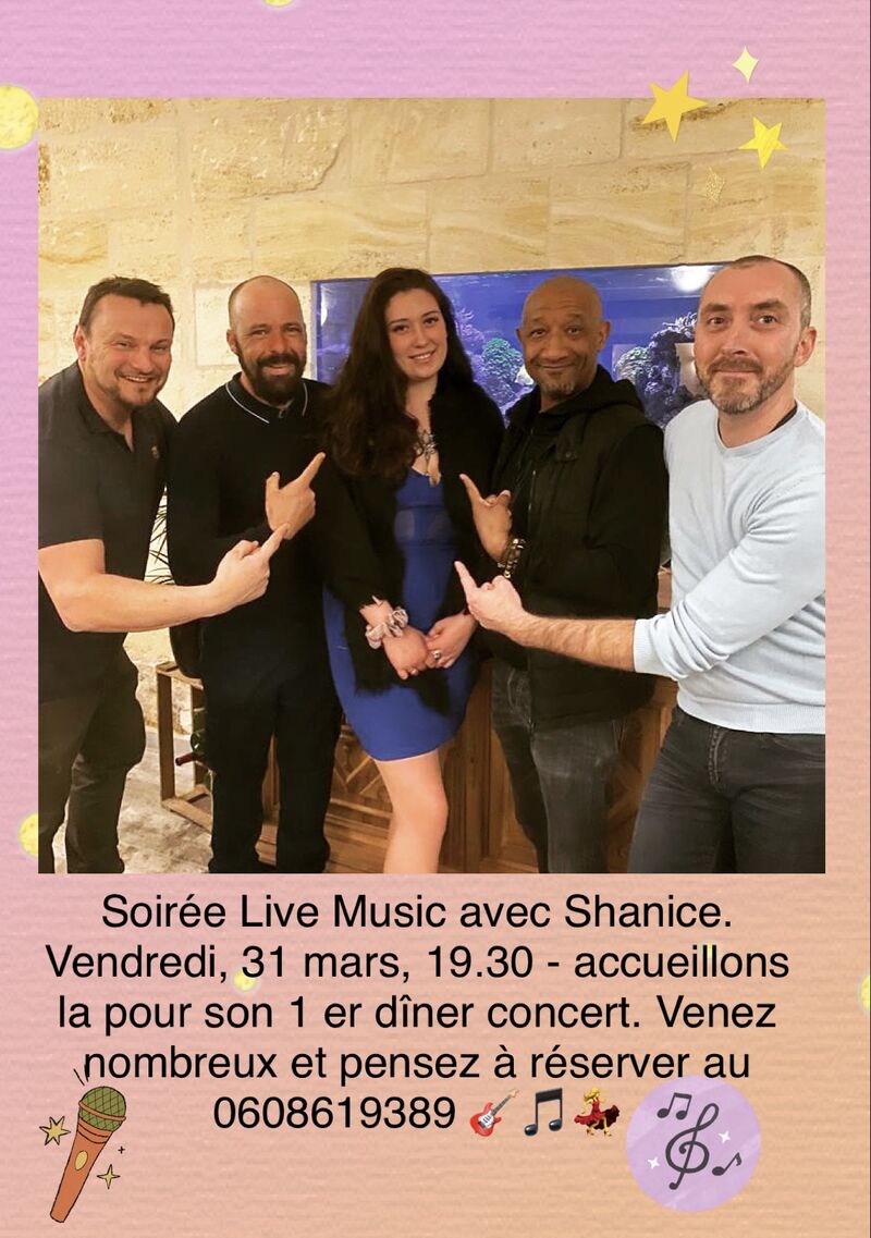 Soirée Live Music avec Shanice. Vendredi, 31 mars, 19.30 - accueillons la pour son 1 er dîner concert. Venez nombreux et pensez à réserver au 0608619389 🎸🎵💃 #music #livemusic #soirée #apero #vin #cocktail #grillade #terrasse #pomerol #happy #surprise #cinema #😋😉