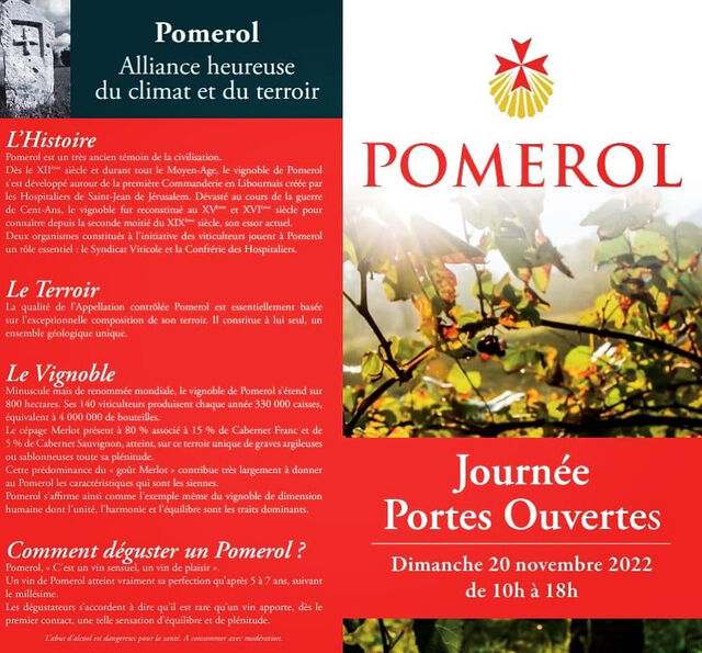 Ouverture exceptionnelle ce dimanche, 20 novembre, de 10h à 18h. Venez profiter de la Journée de Portes Ouvertes de Pomerol avec la dégustation de nos vins. Pensez à réserver! :)