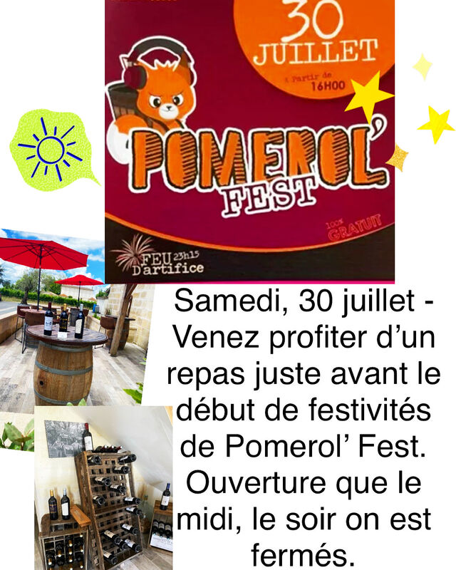 Samedi, 30 juillet - Venez profiter d'un repas juste avant le début de festivités de Pomerol' Fest. Ouverture que le midi, le soir on est fermés.
