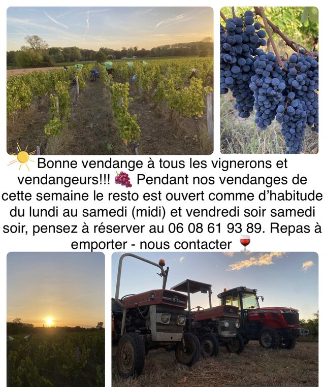 Bonne vendange à tous les vignerons et vendangeurs!!! 🍇 Pendant nos vendanges de cette semaine le resto est ouvert comme d’habitude du lundi au samedi (midi) et vendredi soir samedi soir, pensez à réserver au 06 08 61 93 89. Repas à emporter - nous contacter 🍷