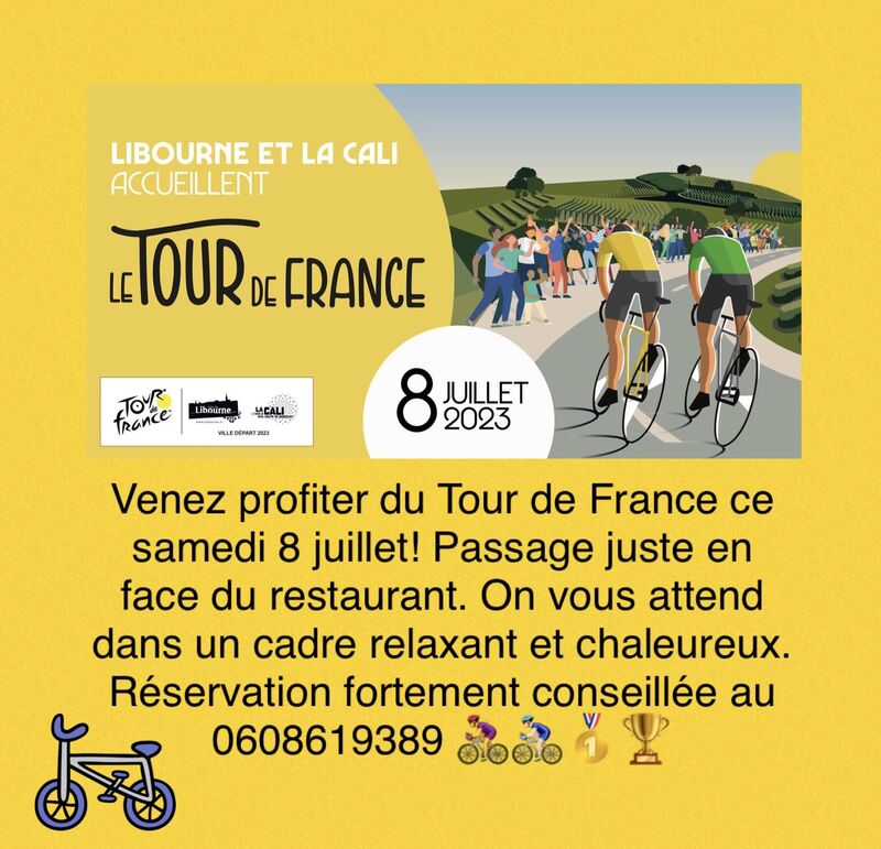 Venez profiter du Tour de France ce samedi 8 juillet! Passage juste en face du restaurant. On vous attend dans un cadre relaxant et chaleureux. Réservation fortement conseillée au 0608619389 🚴♀️🚴🏻♂️🥇🏆
